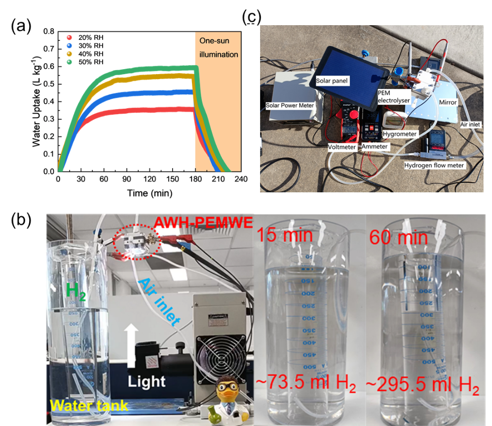质子交换膜电解水(PEMWE)技术是生产绿氢的主要技术路线之一,因其高效率和高纯度氢气输出而备受关注。然而,PEMWE过程严重依赖高纯水作为反应原料,在缺水地区限制了其应用。空气集水(Atmospheric Water Harvesting, AWH)作为获取纯净水的新兴途径,有望为绿氢生产过程中的水源短缺问题提供可行解决方案。