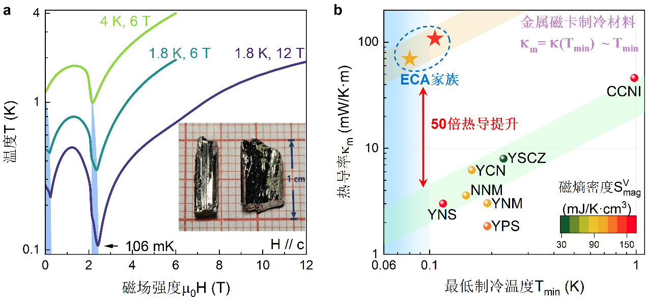 图3. a, ECA材料的绝热去磁制冷测量,在自旋超固态量子相变点附近实现106 mK最低制冷温度。b, ECA材料的热导具有巨大优势,相比于此前报道的磁制冷材料,其热导率提升了1–2个数量级