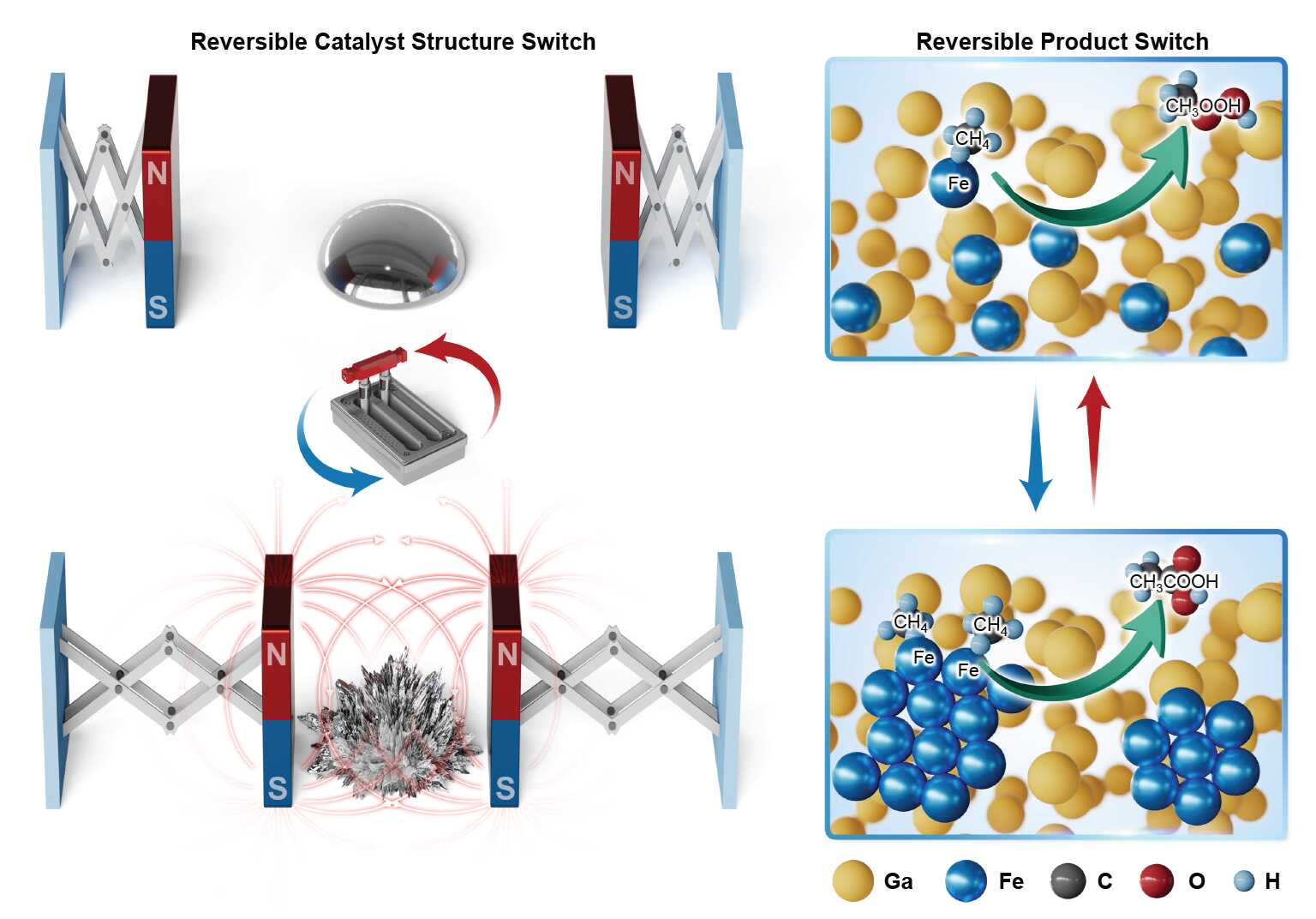 图2. 磁场开关调控下铁基液态金属催化剂(Fe–LMS)的宏观(左)与微观结构(右)变化示意图