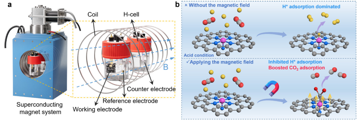 图1. (a) 强磁场环境中CO2RR装置示意图;(b) 磁场增强 Ni−N5−C 催化剂上CO2RR的过程示意图(其中 Ni 为玫瑰红、N 为蓝色、C 为灰色、O为红色、H 为黄色)