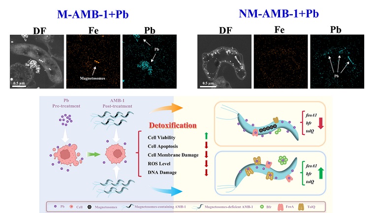 铅(Pb)作为一种生物半衰期长、环境持久性高及毒性强的重金属污染物,已对全球公共卫生安全构成严重威胁。当前临床治疗Pb中毒主要使用金属离子螯合剂,但由于其缺乏特异性及潜在的毒副作用,亟待开发高效且安全的Pb解毒新策略。趋磁细菌凭借高效的重金属富集能力和优良的生物相容性,已广泛应用于环境重金属修复和生物医学领域。然而,对于重金属在生物体内诱导的毒性效应,趋磁细菌能否发挥独特应用优势,目前仍未可知。