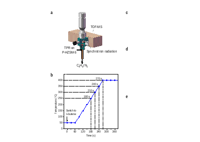 研究者进一步设计实验,观察到了动力学模型中提出的反应路径中C8中间体的生成(图3)。尽管“丁烯二聚后发生β断裂生成乙烯和丙烯”这一路径在理论上被广泛接受,但长期以来缺乏直接的实验证据,尤其是对瞬态存在的C8中间体的捕获极为困难。本研究利用SVUV-PIMS技术直接观测到了C8H16中间体的存在。在程序升温实验中,当体系达到300°C时,SVUV-PIMS清晰地检测到了C8H16信号的产生,与此同时,丙烯和戊烯也开始出现。这一直接的实验证据证实了二聚-β断裂反应路径,为整个KDRC策略的合理性提供了的支撑。