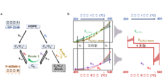 研究者提出,第一段形成的C4/C5中间体在动力学模型中处于核心枢纽地位,它面临着两条竞争路径:一是通过二聚-β-裂解反应选择性地生成目标产物乙烯和丙烯,二是发生氢转移和芳构化生成副产物烷烃和芳烃。KDRC策略通过解耦-耦合优化,精确控制了C4/C5中间体的浓度,从而在第二阶段为后续二聚-β-裂解反应创造了最优动力学条件,使两段反应速率匹配(图1),最终实现了高达79%的乙烯和丙烯收率。